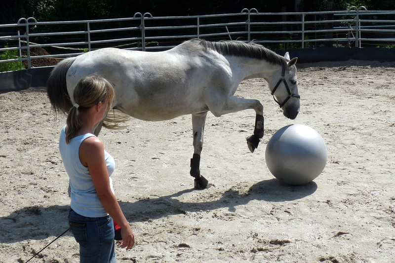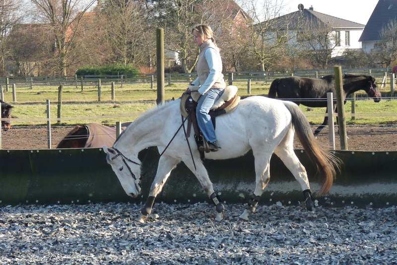 Die Nase im Sand, den Rücken zur Sonne und ein pendelnder Schweif wurden Tagesordnung. Schulter-Herein, Innen- und Außenstellung, Joggen = Lieblingsprogramm. Gymnastik rauf und runter - er ist dabei.