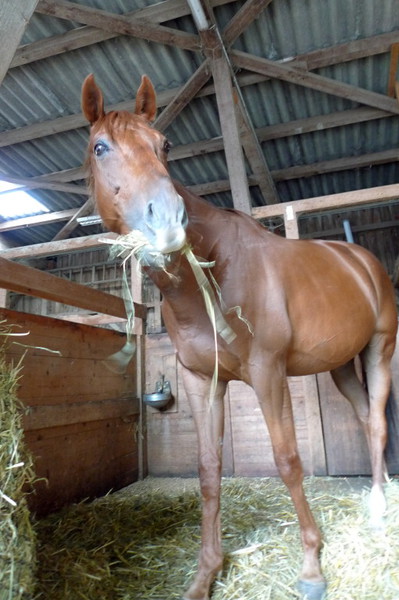 Damit hatte ich "mein" Rennpferd. Fuchs, nicht eben edler Körperbau oder stolze Haltung. Führen ist nicht so seine Sache und reittechnisch ist er noch ausbaubar...
