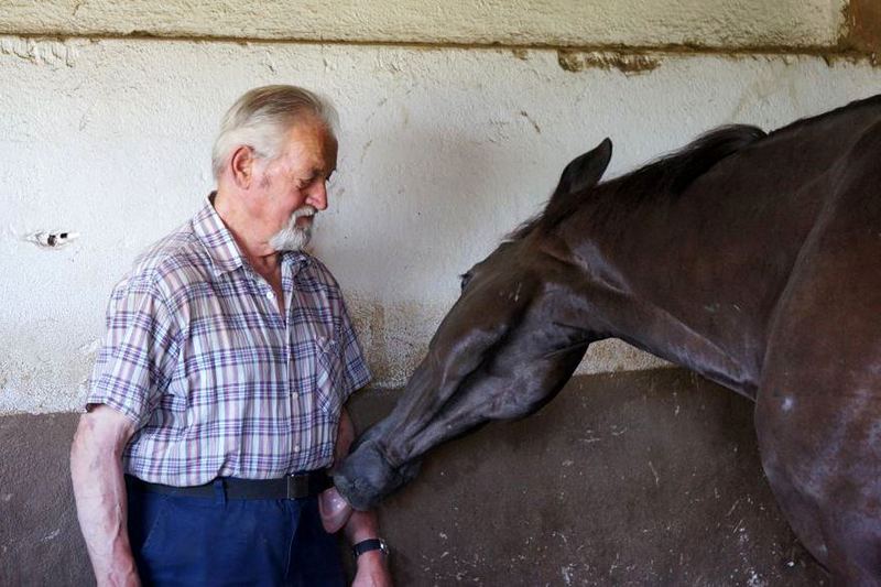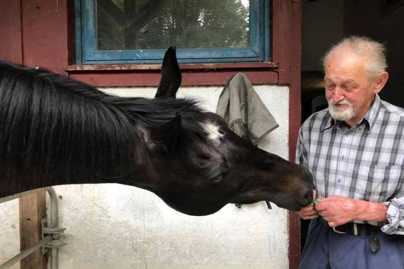 So verschlug es uns ein paar km weiter zu einem älteren Herrn, der eine kleine Truppe von überwiegend verrenteten Pferden beherbergte. King Falcon war immer schon ein sehr empathisches Pferd, aber bei den beiden älteren Herren war es Liebe auf den ersten Blick (oder Lick?), bei Ankunft in seiner Box schaute King Falcon sich Franz genauer an und begann, ihn von oben bis unten abzulecken. Die Freundschaft war so vom ersten Tag an besiegelt und über Jahre verbrachte Franz täglich viel Zeit mit kleinen „Schwätzchen mit seinem Loki“ und steckte ihm immer wieder Eukalyptus-Bonbons zu.
