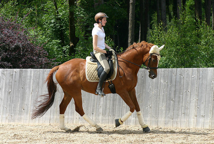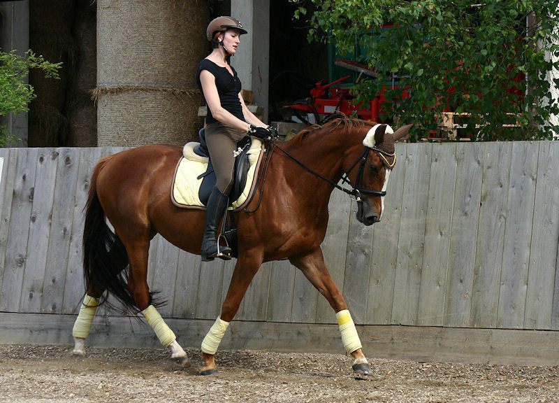 Im Frühling 2004 kam sie frisch vom Rennstall in den Stall, in dem ich damals meine Reitbeteiligung hatte. Dort war eine Bereiterin engagiert, die die Exgalopper ritt und sich darum bemühte, dass die