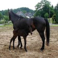 Im Jahr 2003 habe ich mich überreden lassen, Triene decken zu lassen. Auf der Suche nach einem Hengst haben wir uns für den blutgeprägten Trakehner Finley M entschieden. Madrina ist mit einer