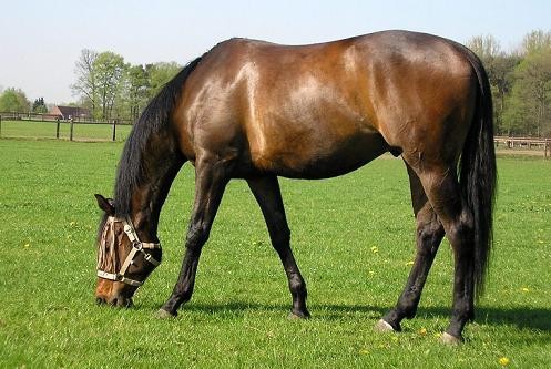 Das mit dem Reiten war sehr viel schwieriger. Ich hatte keine Erfahrungen mit Vollblütern. Und so ging er mir auf unserer Galoppbahn durch. Ich flog in der Kurve runter und knallte gegen einen grossen Holzeckpfeiler, mit dem Ergebnis, dass ich mich 6 Wochen nicht bewegen konnte, da ich mein Nackenband eingeklemmt hatte. Ich gab Monster in dieser Zeit in Beritt. Als ich genesen war, versuchte ich es erneut mit dem Reiten. Diesmal nicht wie auf den Warmblütern zuvor gelernt, sondern sehr, sehr sensibel. Und es klappte!! Im darauf folgenden Jahr ritt ich meinen ersten Ausritt in die Bockholter Berge. Es war super schön. Nach und nach gewöhnte ich Monster an Führanlage, Solarium und dass er still stehen bleiben muss, wenn ich aufsitzen möchte. Das hat alles sehr, sehr lange gedauert. Aber heute kann Monster alles, was wichtig ist. Er bleibt sogar in der Halle stehen, wenn ich mit dem Reiten fertig bin und eben zur Toilette gehen muss und wartet da, wo ich ihn stehen gelassen habe auf mich. Andere können um ihn rum reiten und es stört ihn nicht. Das ist für mich ein sehr grosses Glück. Und wenn ich sehe, wie er mit seinen Freunden spielt und über die Wiese tobt, denke ich manchmal, dass ich es richtig gemacht habe, als ich mir diesen kleinen unförmigen Vollblüter gekauft habe.
