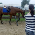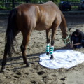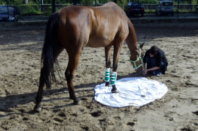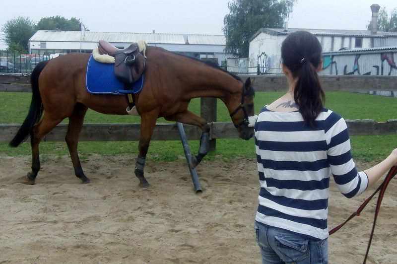 Am Anfang hatten wir eine Menge Probleme mit dem Satteln, Mozart hat nämlich Gurtzwang wie sonstwas. Ich habe mittlerweile aber eine Art zu gurten gefunden, die ihm zusagt, wir bleiben eben immer in Bewegung... dann merkt er den Gurt gar nicht mehr. Doch vorher musste ja erst einmal eine Aufgabe für ihn gefunden werden - denn Mozart machte überhaupt nichts Spaß. Es wurde zwar mitgemacht, aber begeistert war er nicht.