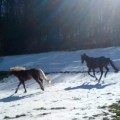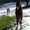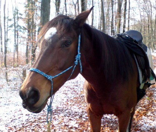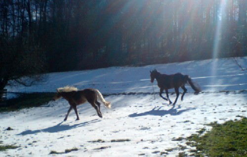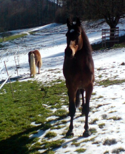 Wir gaben nicht auf. Seit Februar diesen Jahres habe ich einen eigenen Stall gemietet, bei zwei liebenswürdigen Menschen. Damit Papajo nicht alleine ist, kaufte ich den kleinen Norman. Er führt nun Rangordnungskämpfe mit ihm. Die Magengeschwüre sind ausgeheilt. Er bekommt kein Getreide mehr und koppt nur noch wenig. Papajo und ich sind mittlerweile im Parelli Ende Level II. Ich reite mit Wassertrense und oft nur mit Halfter. Im Gelände macht er sich toll. Wir haben die Dualaktivierung kennengelernt und reiten Dressur nach Philippe Karl. Die Biegungen machen uns noch Schwierigkeiten, dafür haben wir nach langem Üben den Linksgalopp gelernt. Wir hatten viele Höhen und Tiefen, jedoch den Mut und die Hoffnung nicht verloren. Mit Liebe und Geduld haben wir sehr viel erreicht. Er ist ein guter Freund und treuer Begleiter.