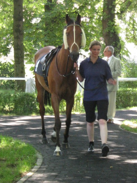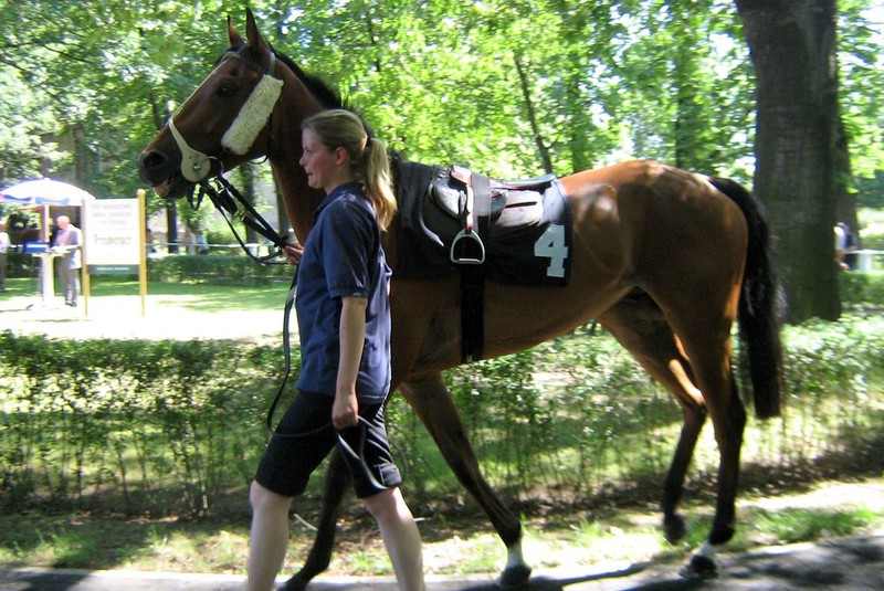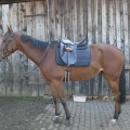 Und da ich auch schon ein etwas Erfahrung mit Vollblütern und (Ex)Rennpferden hatte, gab es zum Glück keine Anfangsschwierigkeiten. Im Gelände war er von Anfang an unerschrocken, zuverlässig und immer leicht zu regulieren, sowohl alleine als auch in der Gruppe. Auch heute geht Perucci überwiegend ins Gelände, aber nebenbei versuchen wir es mit ein wenig dressurmäßiger Arbeit. Was die Dressur angeht, hatten wir durch die eine oder andere kleinere Zwangspause und auch teilweise die äußeren Umstände einige Rückschläge zu verbuchen, aber seit wir vor etwas mehr als einem Jahr eine Trainerin gefunden haben, die neben „normalem" Dressurreiten und Unterrichtserteilung auch Vollbluterfahrung hat (sie hat selbst ein paar umgeschulte Ex-Galopper), geht es auch damit aufwärts.