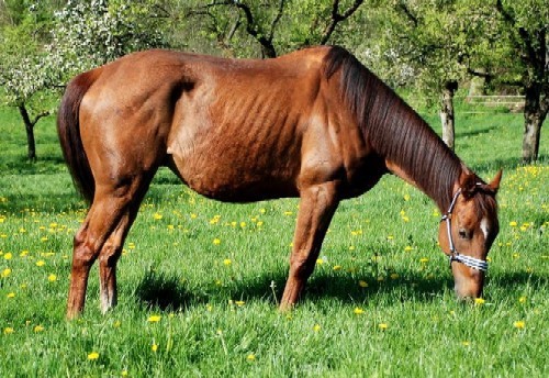 Was sie fand, war ein 5-jähriges Pferd, welches locker als 3-jährig durchginge - ziemlich verzottelt und sehr dünn. Wir schätzen so um die 400 kg, mit sehr langen und ungepflegten Hufen.