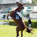 Dann kam sein 2. Auftritt in Bad Harzburg. Er stand unten vorm Stall und bewegte sich keinen Meter. Auch auf dem Weg zur Bahn blieb er immer wieder stehen, ich war fix und fertig mit dem Nerven. Ich bat Cevin Chan, der ihn reiten sollte, er solle ihn mir heile wieder bringen. Die nächste Viertelstunde ging ich durch die Hölle. Zusehen war kaum möglich. Schatti sprang so schlecht, dass ich jeden Moment mit einem Sturz rechnete. Doch zum Glück kam er heil wieder und ich wusste, dass es nur eine Frage der Zeit war, bis irgendwas passiert. Immerhin hatte auch Herr Seiler ein Einsehen und entschloß sich, ihn zu verkaufen.