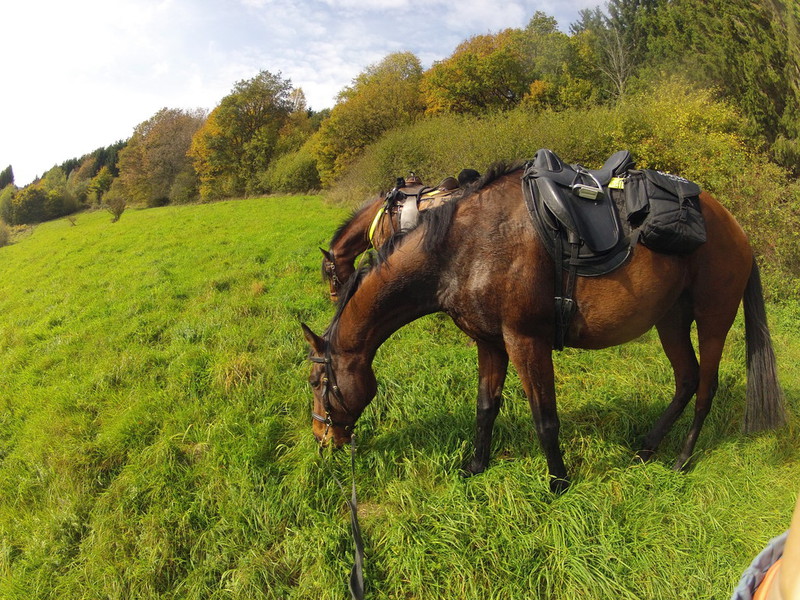 Diesen Herbst haben wir (zusammen mit meiner Tochter und ihrem Pferd) unseren ersten Zweitagesritt mit Übernachtung in fremder Umgebung bewältigt. Ein unvergessliches Erlebnis, das uns allen sehr viel Spaß bereitet hat. Auch in unbekanntem und mittelschwerem Gelände hat Shirana sich als temperamentvolles aber ausgeglichenes Pferd gezeigt – mit gutem Vertrauen zu mir und auch zu ihrem eigenen Können. Die Übernachtung im fremden Paddock stellte wohl auch kein Problem mehr dar: Der ganze Heuballen war am Morgen vertilgt und sie wirkte ausgeglichen und zufrieden.