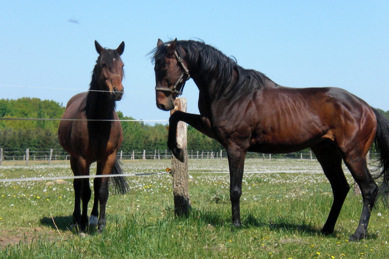 Es kam auch vor, dass er versuchte, fremde Menschen von der Weide zu treiben, so den Nachbarn, der es gut meinte und Äpfel für die Pferde auf dem kurzen Weg durchs Paddock zu uns bringen wollte. Diese und noch einige andere Starallüren hat Twingo wohl von der Bahn mitgebracht. Er muss immer der erste sein, immer das Gefühl haben, dass Besucher ihn bewundern. Bekommt der Weidenachbar mehr Aufmerksamkeit oder wird als erster gefüttert oder begrüsst, geht Twingo zum Holzzaun, zielt, und tritt mit voller Wucht die Pfosten kaputt. Es ist fast menschlich, wie jähzornig er sein kann und wie er seiner Wut oft grunzend und wild scharrend Luft macht.