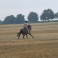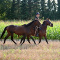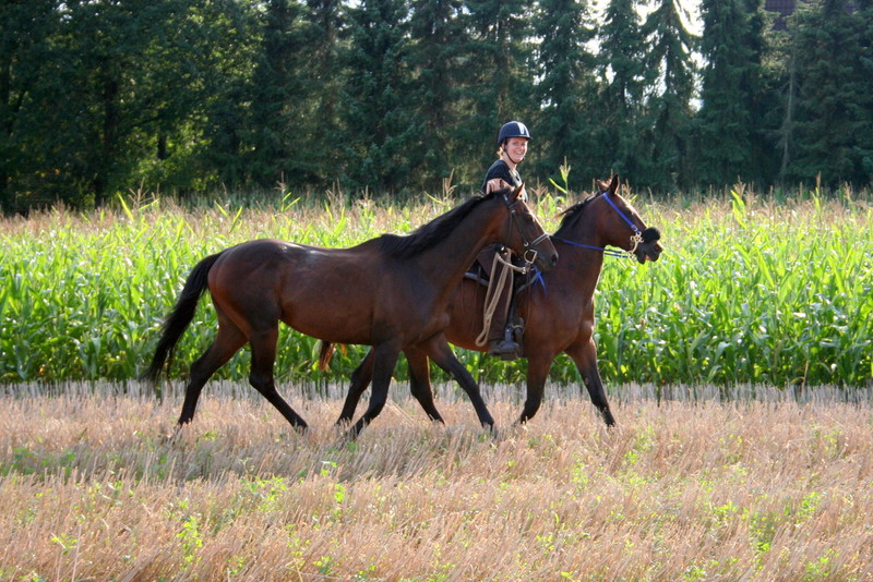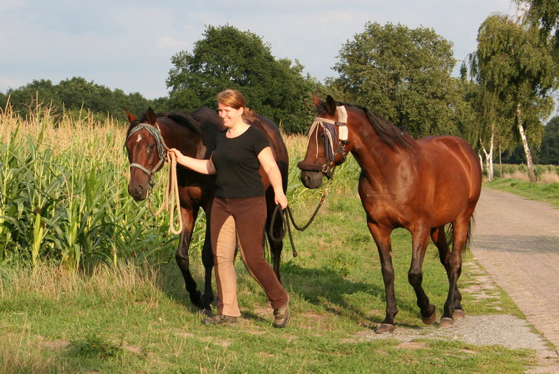 Hof ritt. Ich bin knappe drei Wochen ein bis zweimal am Tag im Schritt ausgeritten, dann ging es in die Sommerweide mit meinem Traber Marenco. Beide Pferde liefen toll zusammen und passten