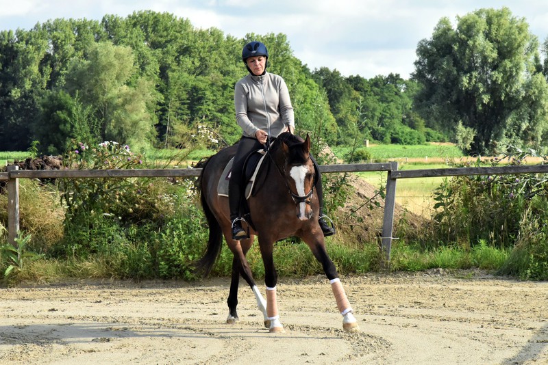 So gelangte er über eine Verkaufsanzeige zu seiner heutigen Besitzerin, die ihn liebevoll und konsequent zum Reitpferd umgeschult hat. Inzwischen läuft Warwing auf L-Niveau in der Dressur.
